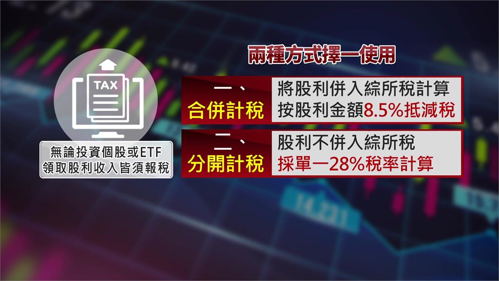 隨著報稅季到來,投資人也開始盤點股利收入,無論個股或ETF,所賺取的股利皆須報稅,主要分成兩種方式,第一種為合併計稅,股利併入綜所稅計算,按股利金額8.5%抵減稅額,另一種為分開計稅,股利不併入綜所稅,採單一28%稅率計算。