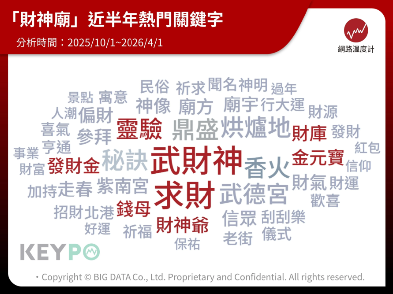 許多人會在財神聖誕這天,到財神廟走走、求財祈福,《網路溫度計DailyView》透過輿情分析軟體《KEYPO大數據關鍵引擎》調查,來看「財神廟」近半年(2025/10/1~2026/4/1)網路熱門關鍵字,可見「武財神、求財、財庫、錢母、發財金、金元寶、財神爺、靈驗」等字詞。