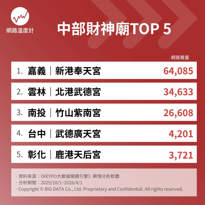 台灣中部坐擁多座知名財神廟,長年香火鼎盛,吸引不少民眾專程前往參拜祈福,希望為自己帶來穩定財運與好兆頭。《網路溫度計DailyView》透過輿情分析軟體《KEYPO大數據關鍵引擎》,進一步盤點網路討論度最高的「中部五大財神廟」排行榜,作為民眾規劃參拜行程與求財開運的參考指標。此次入榜的前五名依序為:「嘉義新港奉天宮」、「雲林北港武德宮」、「南投竹山紫南宮」、「台中武德廣天宮」、「彰化鹿港天后宮」。