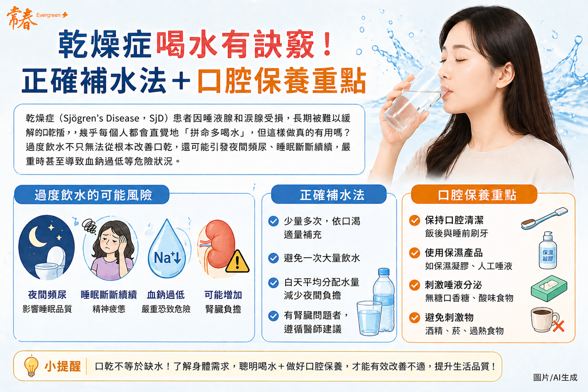 乾燥症(Sjögren's DiseaseSjD)患者因唾液腺和淚腺受損,長期被難以緩解的口乾折磨,幾乎每個人都會直覺地「拼命多喝水」,但這樣做真的有用嗎?過度飲水不只無法從根本改善口乾,還可能引發夜間頻尿、睡眠斷斷續續,嚴重時甚至導致血鈉過低等危險狀況。