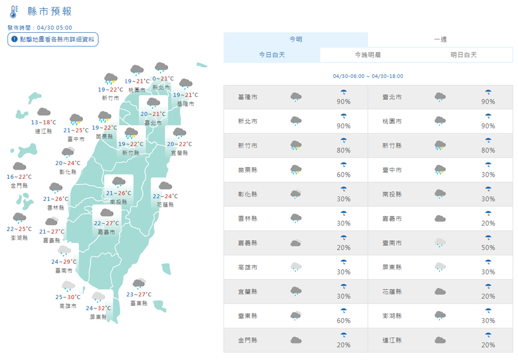 4/30各縣市天氣預報。圖/翻攝自中央氣象署