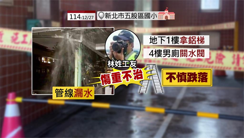 深夜地震後,學校4樓廁所外水管破裂,水花飛濺一地,走廊滿是積水,附近住戶急忙報案,沒想到提早趕到的工友為了關閉水閥,不幸發生死亡意外。事發在新北五股區一間國小,住在學校對面的林姓男工友發現4樓廁所外的管線漏水,想要修補,他從地下1樓拿著鋁梯走上4樓男廁想關閉水閥,沒想到疑似爬梯不慎跌落,後腦勺著地重擊,直到警消和校方人員尋找出水處,才發現他倒臥在地,但緊急送醫搶救仍傷重不治。
