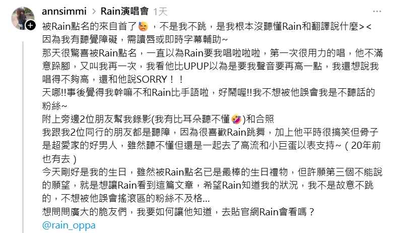 Rain詢問粉絲為什麼不跳。圖/Threads@annsimmi授權提供粉絲還指出,演唱會當天是自己的生日,「雖然被Rain點名已是最棒的生日禮物,但許願第三個不能說的願望,就是想讓Rain看到這篇文章,希望Rain知道我的狀況,我不是故意不跳的,不想被他誤會搖滾區的粉絲不及格」。