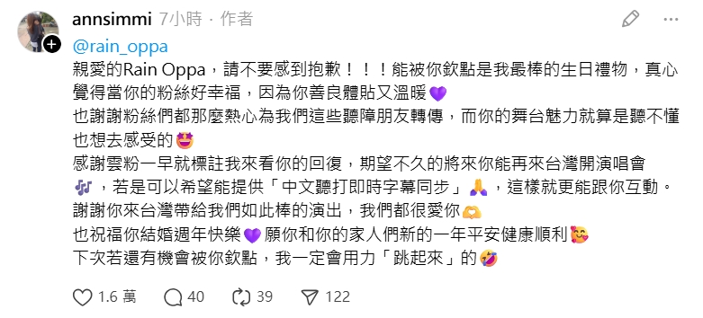 當事粉絲也馬上回應,要Rain別感到抱歉,「能被你欽點是我最棒的生日禮物,真心覺得當你的粉絲好幸福,因為你善良體貼又溫暖,也謝謝粉絲們都那麼熱心為我們這些聽障朋友轉傳,而你的舞台魅力就算是聽不懂也想去感受的」。