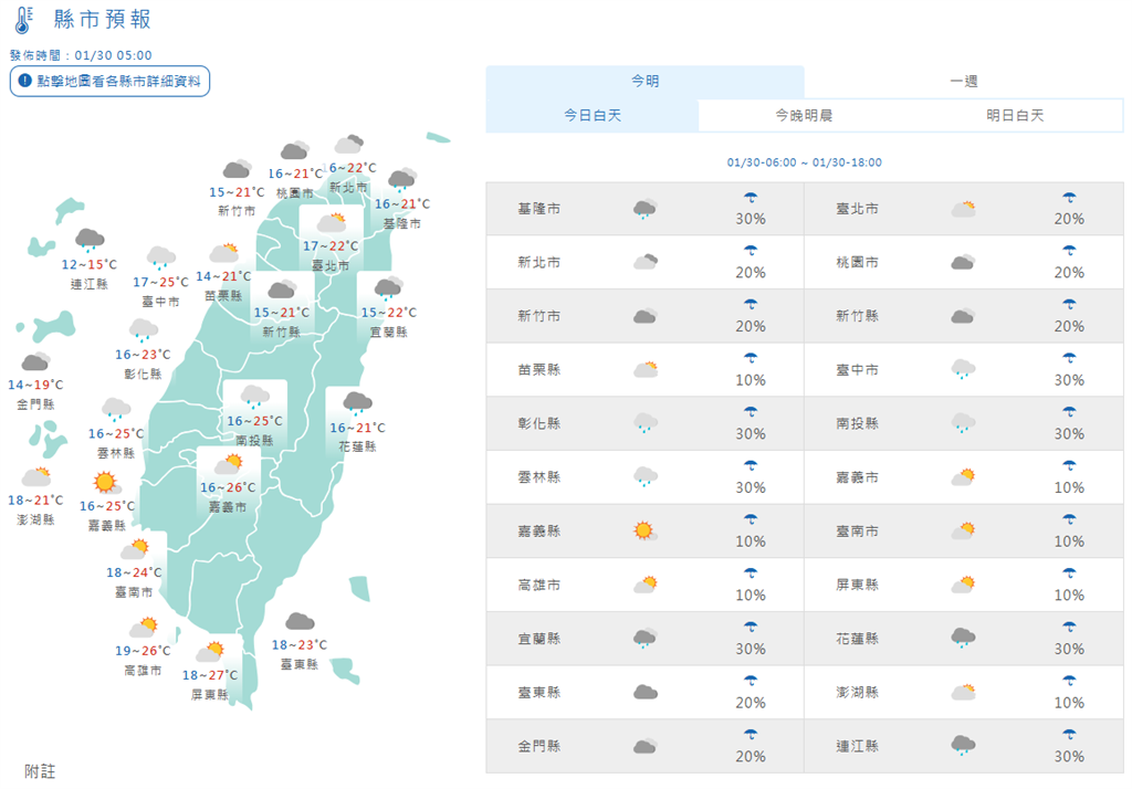 1/30全台天氣預報。圖/中央氣象署