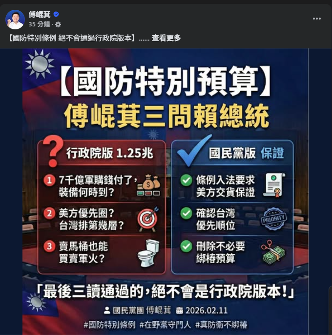 傅崐萁於臉書發文批評,賴清德以「話術」蒙蔽國人,稱國民黨團將提出自己的版本,與民眾黨進行協商,主張把對美採購的「交貨期程保證」等要求入法。他強調,政院版是否付委「已非重點」,因為最後三讀通過的「絕不會是行政院版本」,在野黨不可能照單全收。