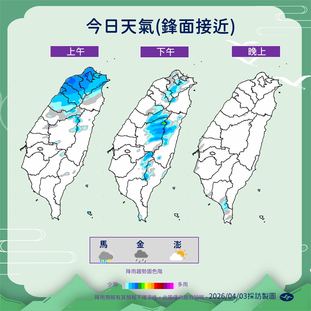 針對今日的天氣詳情,中央氣象署說明,清晨至上午中部以北及東北部地區,有局部短暫陣雨或雷雨,北台灣並有局部較大雨勢發生,東部、東南部地區亦有零星短暫陣雨,其他地區為多雲,午後北部地區及其他山區亦有零星短暫雷陣雨;晚起隨著鋒面接近,中部以北地區轉為零星短暫陣雨,外出請記得攜帶雨具備用。