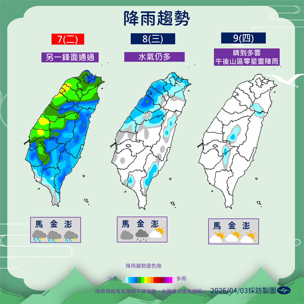 週日(5日)清明節鋒面仍在附近,各地仍有降雨,️中北、宜花地區,南部山區都有陣雨或局部雷雨,南部、東南部也有零星陣雨;週一(6日)收假日,又有下一道鋒面接近,天氣持續不穩定,️中部以北地區局部陣雨或雷雨,外出都有備好雨具,交通行車注意路況。