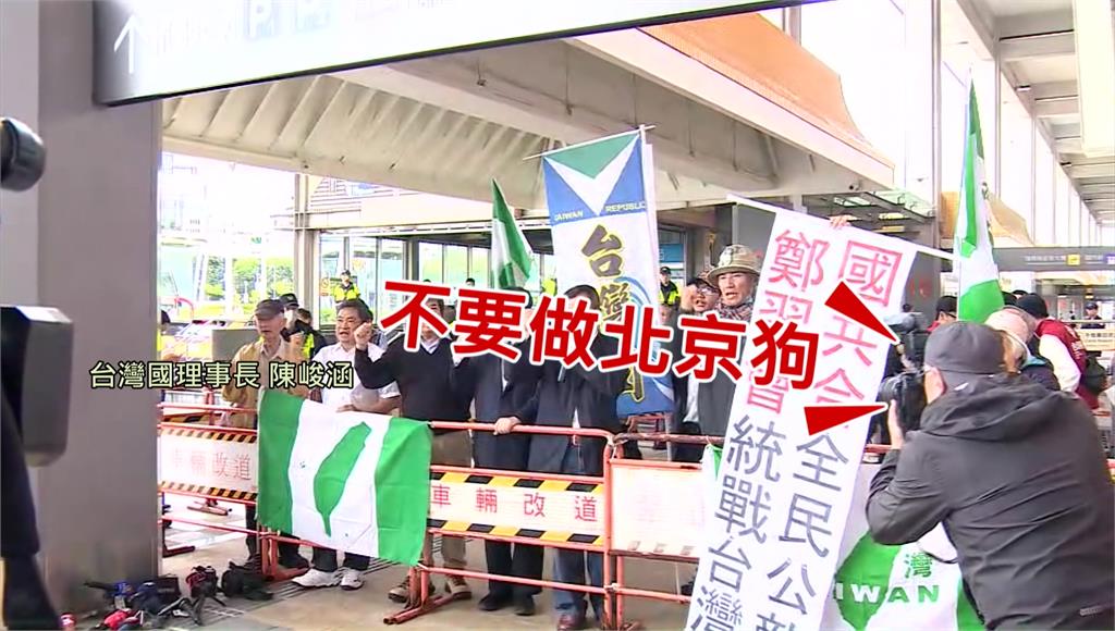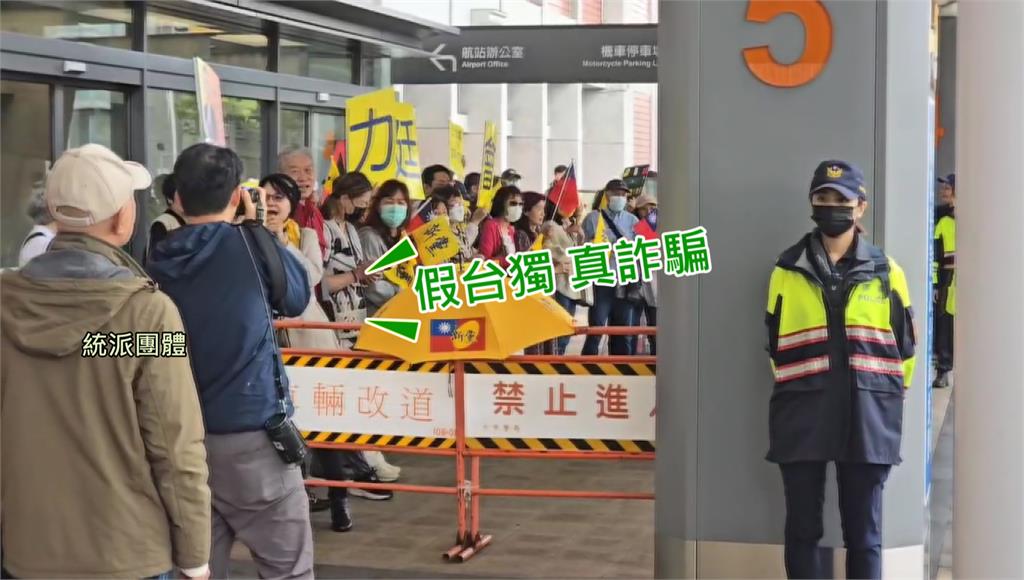台派、統派聚集松山機場外抗議。圖/台視新聞全撲空!鄭麗文走商務通道出關 疑避獨派團體嗆聲