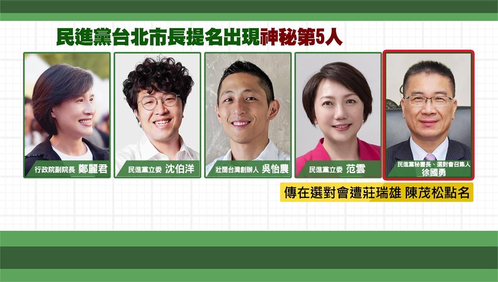 民進黨5位被點名選北市的人選。圖/台視新聞製圖再進一步統整民進黨台北市長提名人選,還有壯闊台灣創辦人吳怡農、立委范雲,最新還出現「神秘第5人」,就是民進黨秘書長、選對會召集人徐國勇,他疑似在選對會頻頻遭莊瑞雄、陳茂松點名,但他依舊笑而不答,未正面回應。