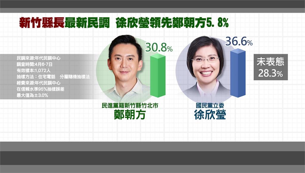 竹縣最新民調,徐欣瑩領先鄭朝方5.8%。圖/台視新聞製圖台北/陳可親、郭致汎 責任編輯/陳盈真