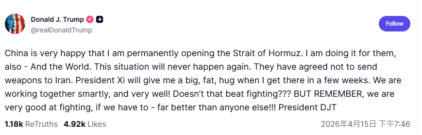 川普也在社群上發文證實,稱中國已經答應他不向伊朗輸送武器,並稱自己幾週後到中國,「習近平主席會給我一個大大的擁抱」。川普更指出,中國很高興他永久開放荷姆茲海峽,並強調自己這樣做是為了全世界,「這種情況絕對不會再發生」。