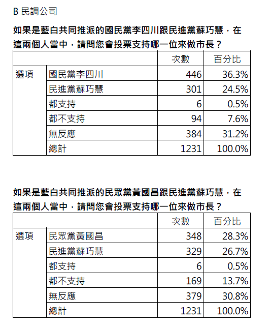 第一家A民調公司民調結果。圖/競選團隊提供第二家B民調公司,若是李四川對上蘇巧慧,支持度是36.3%、24.5%,黃國昌對上蘇巧慧,支持度是28.3%、26.7%。