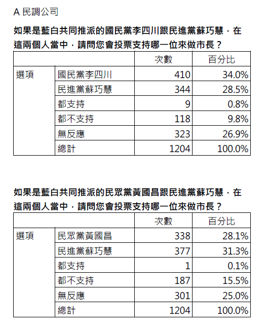 根據藍白公布的民調數字,第一家A民調公司數據,若是李四川對上蘇巧慧,支持度是34%、28.5%,如果是黃國昌對上蘇巧慧,支持度則是28.1%、31.3%。